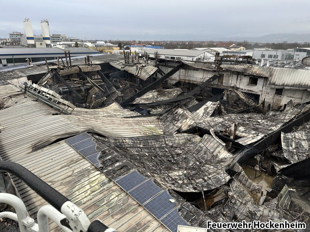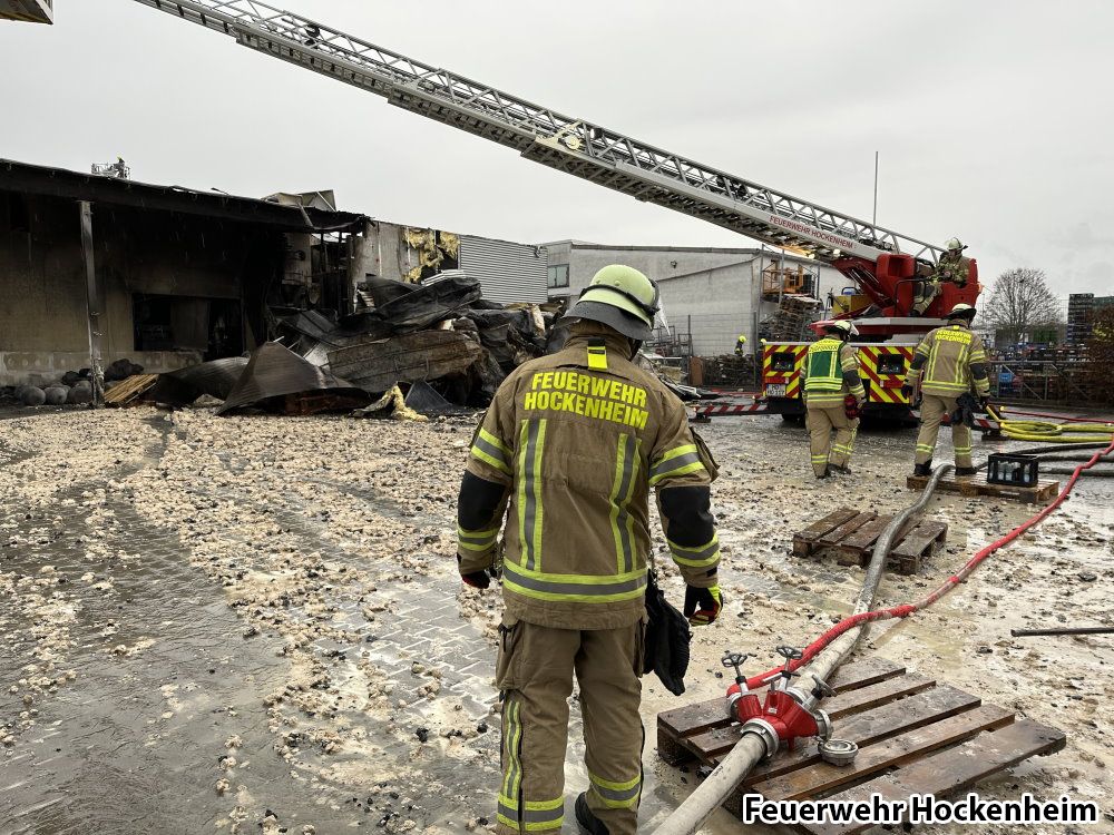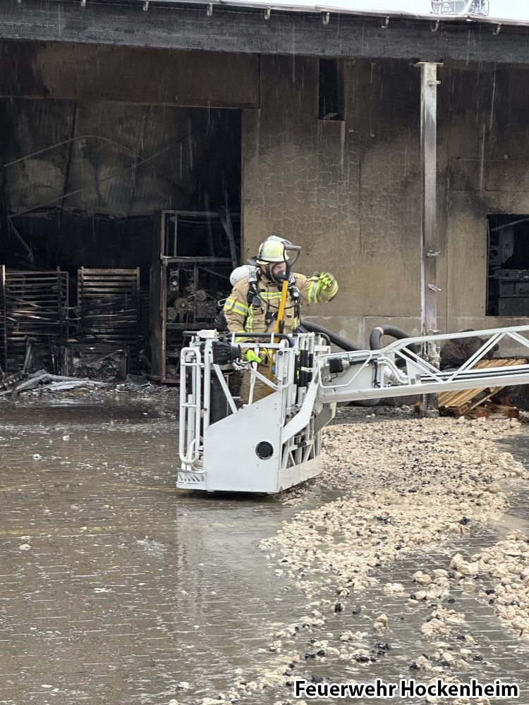 Überlandhilfe. Großbrand Bäckerei. Feuerwehr Walldorf, sowie weitere Feuerwehren aus dem Rhein-Neckar-Kreis bereits seit dem Vorabend vor Ort. Nach dem Vollbrand einer Großbäckerei (Produktion, Verwaltung und Verkauf) wurde die Feuerwehr Hockenheim zur Überlandhilfe angefordert. Im Rahmen der Einsatzmaßnahmen wurden vier Mehlsilos, sowie der Dachbereich auf der Gebäuderückseite abgelöscht. Außerdem wurde brennende Kartonage im Inneren der Halle per Außenangriff abgelöscht. Nach Rücksprache mit der Einsatzleitung der Feuerwehr Walldorf konnte die Feuerwehr Hockenheim gegen 11:40 Uhr aus dem Einsatz entlassen werden.