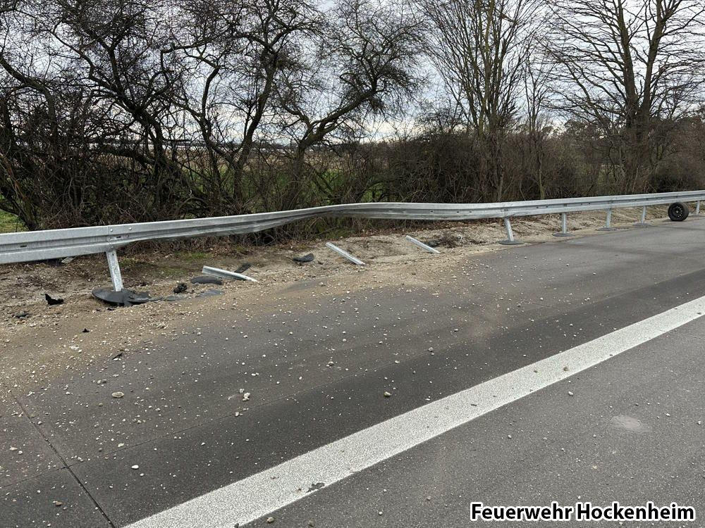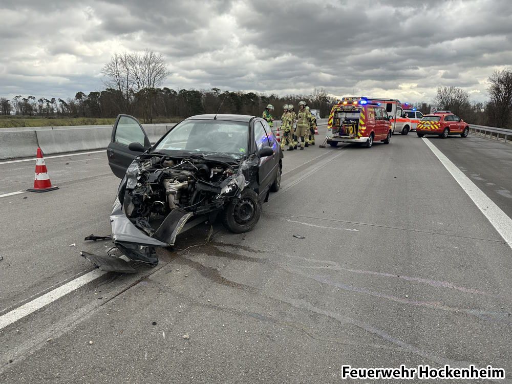 Bei Eintreffen konnte ein Verkehrsunfall mit einem beteiligten PKW festgestellt werden. Nach einem Zusammenstoß mit der Leitplanke stand der PKW auf der mittleren Fahrspur in Richtung Heibronn. Polizei und Rettungsdienst waren bereits vor Ort. Der verletzte Fahrer wurde durch den Rettungsdienst versorgt. Es waren keine Personen eingeklemmt. Durch die Feuerwehr Hockenheim wurde die Einsatzstelle abgesichert und auslaufende Betriebsstoffe abgestreut. Außerdem wurde die Fahrbahn grob gereinigt.