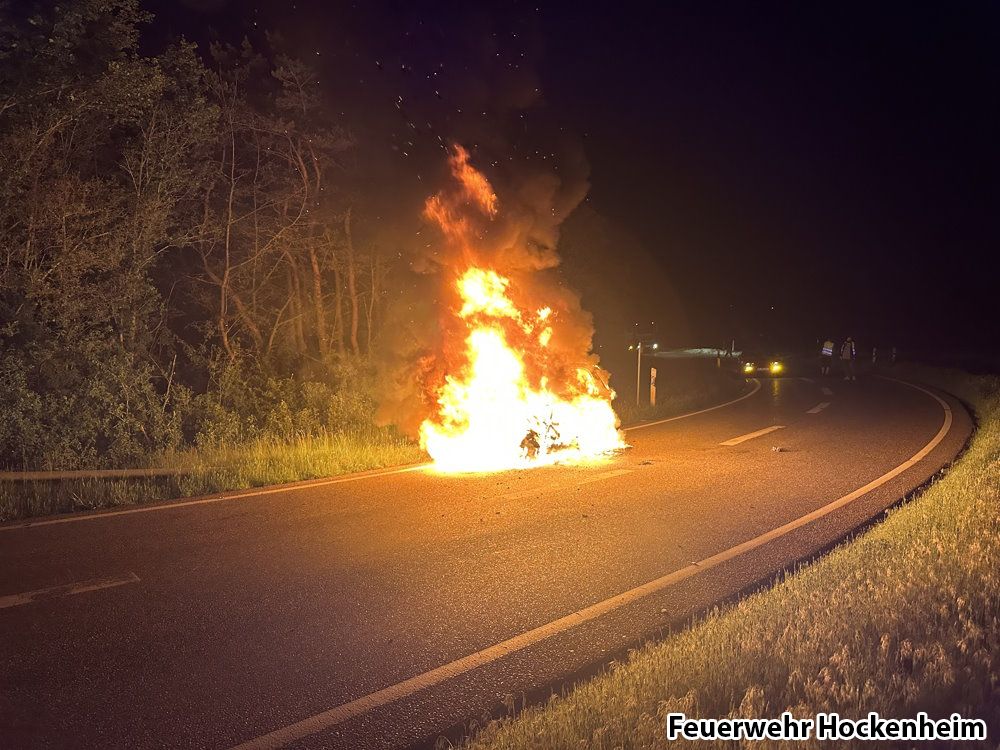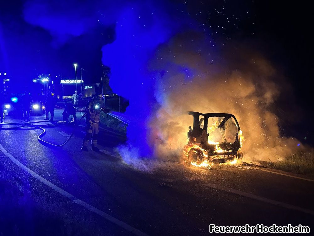 Fahrzeugbrand im Bereich B39/Talhausstraße. Bei Eintreffen brannte ein PKW in voller Ausdehnung. Das brennende Fahrzeug wurde mit einem C-Rohr unter Atemschutz gelöscht. Außerdem wurde die Einsatzstelle abgesichert und ausgeleuchtet. Nachdem das Feuer gelöscht war, erfolgte eine Nachkontrolle mittels Wärmebildkamera. Zum Tausch der verunreinigten Kleidung kam außerdem der GW-T samt Hygienekomponente an die Einsatzstelle. Abschließend wurde die Einsatzstelle an die Polizei übergeben. Durch die Polizei wurde dann die Fahrbahnreinigung veranlasst.