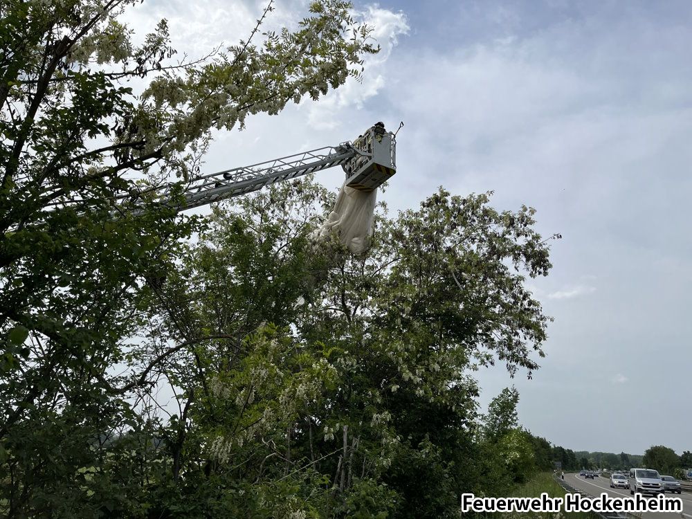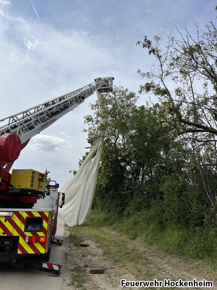 Amtshilfe für die Polizei auf einem Wirtschaftsweg im Bereich der L722. Vermutlich durch eine Windböe war eine Folie zum Abdecken von Ackerflächen in einen Baum geweht worden und drohte auf die Autobahn weitergeweht zu werden. Mittels Drehleiter wurde die Folie vom Baum geholt und dem Eigentümer übergeben.