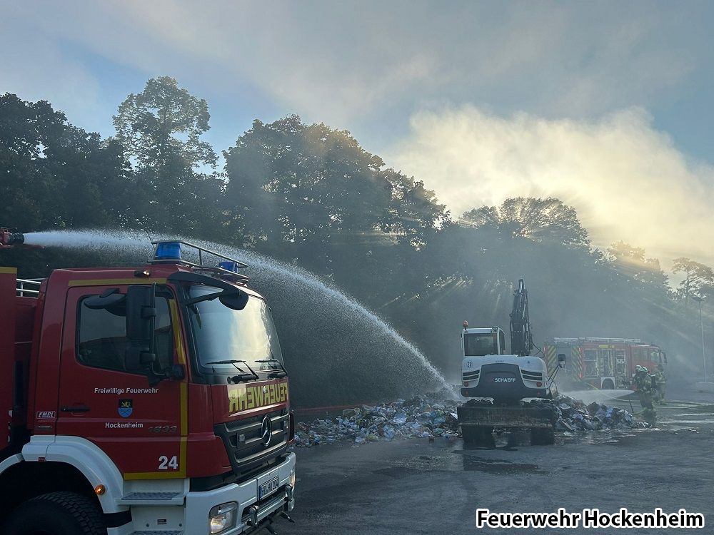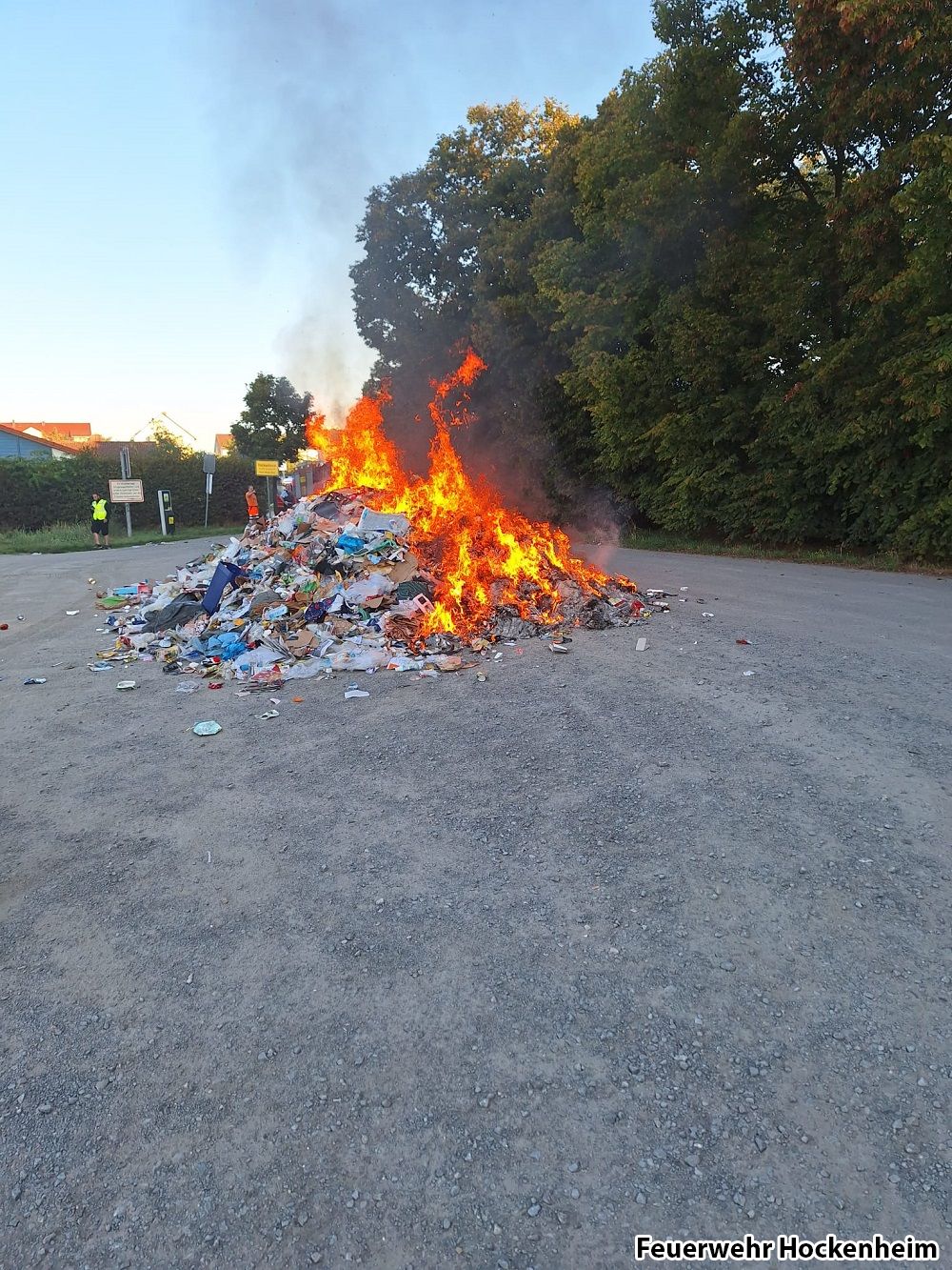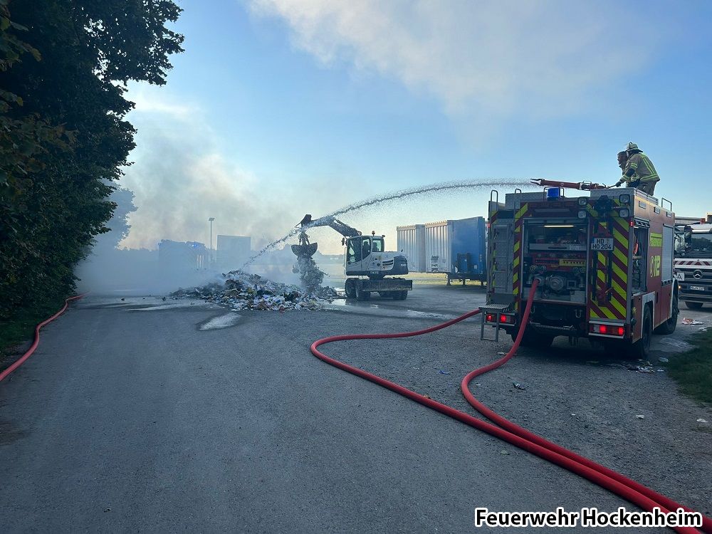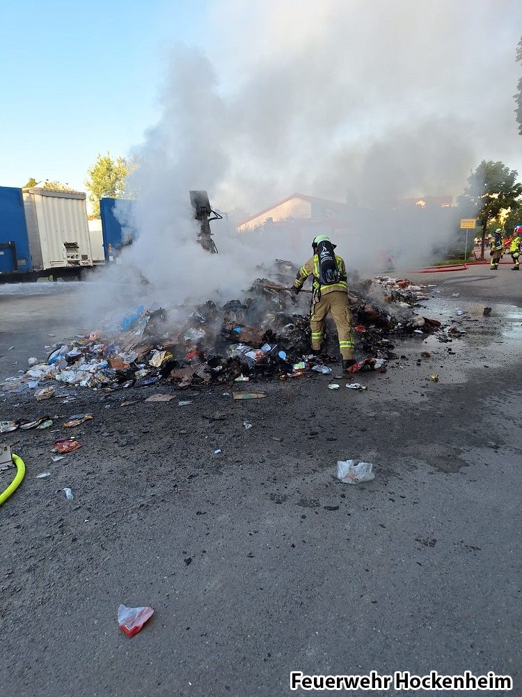 Bei Eintreffen an der Einsatzstelle hat ein Müllfahrzeug den brennenden Müll auf den Parkplatz am Pumpwerk abgeladen. Der Brand wurde mit einem C-Rohr unter Atemschutz sowie mit dem Wenderohr des Tanklöschfahrzeuges abgelöscht. Es stand ein Bagger einer Firma zum auseinanderziehen des Mülls zur Verfügung. Ebenso wurde der Radlader der Stadt Hockenheim zur Unterstützung hinzugerufen.