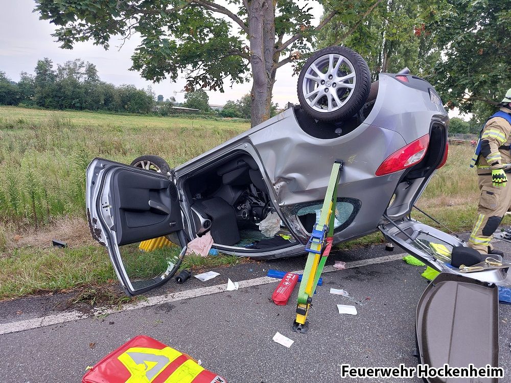 Die Feuerwehr Hockenheim wurde zu einem Verkehrsunfall in die Gustav-Stresemann-Straße alarmiert. PKW liegt auf dem Dach.