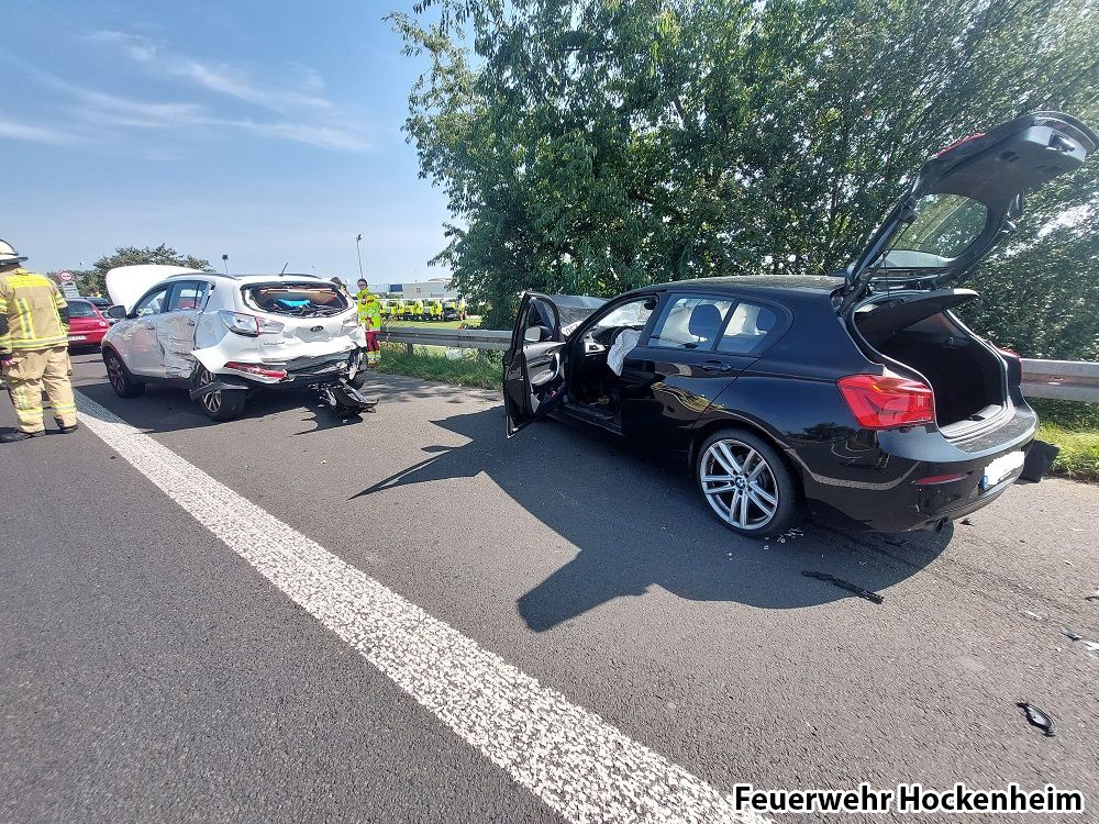 Durch die Feuerwehr Hockenheim wurde die Einsatzstelle abgesichert. Außerdem wurden auslaufende Betriebsstoffe abgestreut und die Batterien zweier Unfallfahrzeuge abgeklemmt.