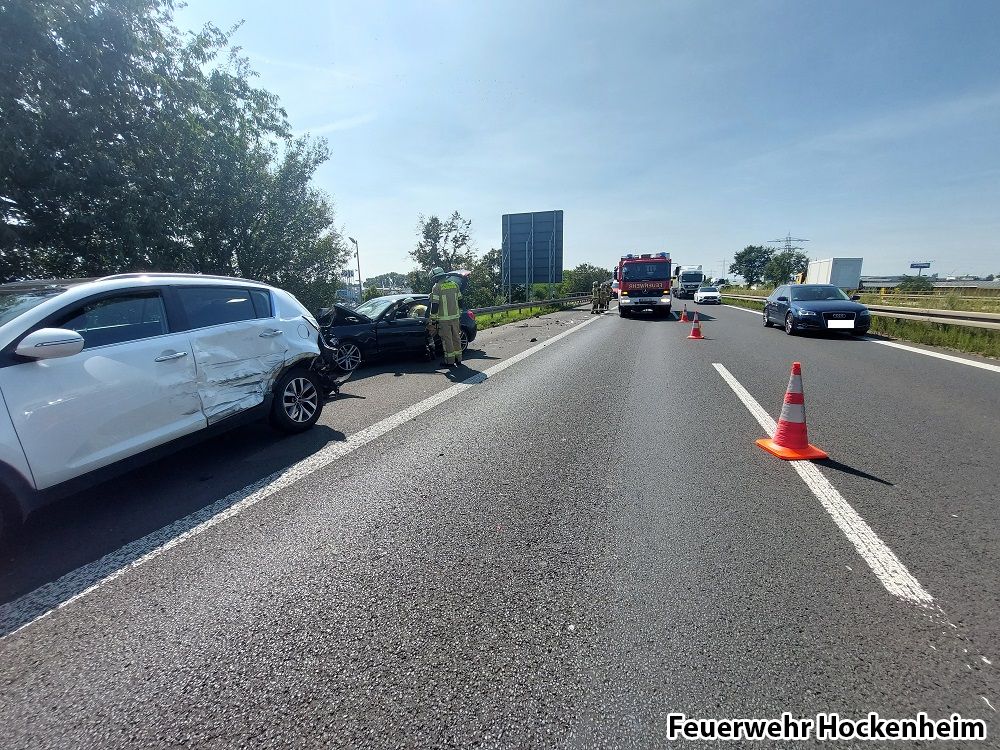 Bei Eintreffen zwischen der Anschlußstelle Hockenheim und Autobahndreieck Hockenheim ereignete sich ein Verkehrsunfall mit 4 beteiligten PKW`s. Keine Personen eingeklemmt. Alle Verletzten wurden bereits durch den Rettungsdienst versorgt.