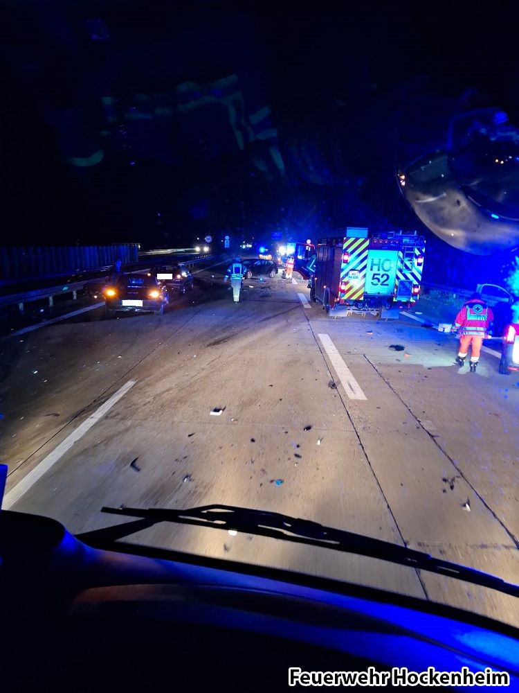 Bei Eintreffen an der Einsatzstelle wurden 2 PKW und ein PKW mit Anhänger vorgefunden. Die Feuerwehr Hockenheim hat die Einsatzstelle ausgeleuchtet und abgesichert.