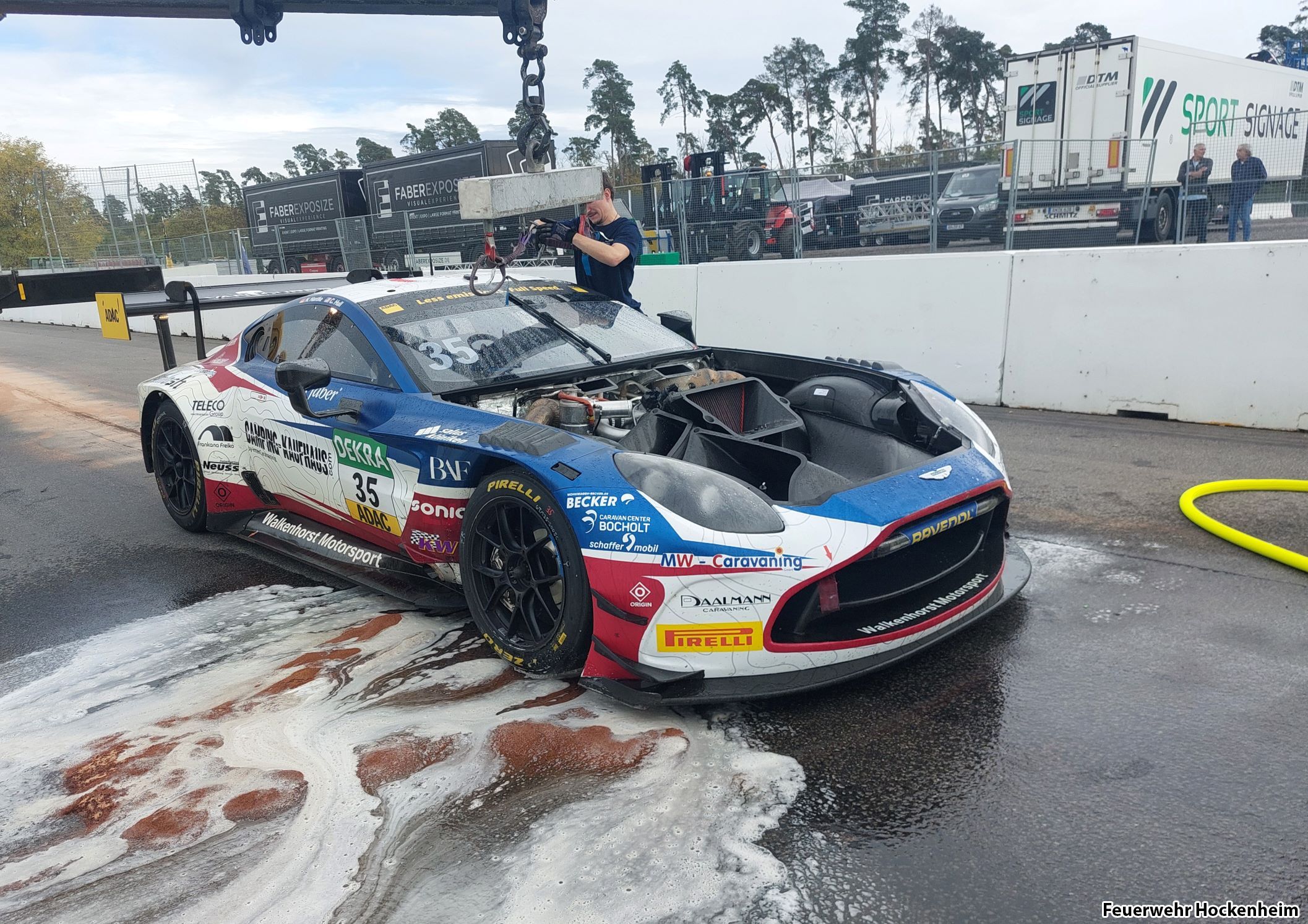 Beim Sicherheitswachdienst der DTM brannte ein Fahrzeug. Die Streckenposten haben den Motorbrand mit Schaumlöscher abgelöscht. Bei Eintreffen an der Einsatzstelle wurde das Fahrzeug kontrolliert und mit dem Schnellangriff Nachlöscharbeiten vorgenommen.