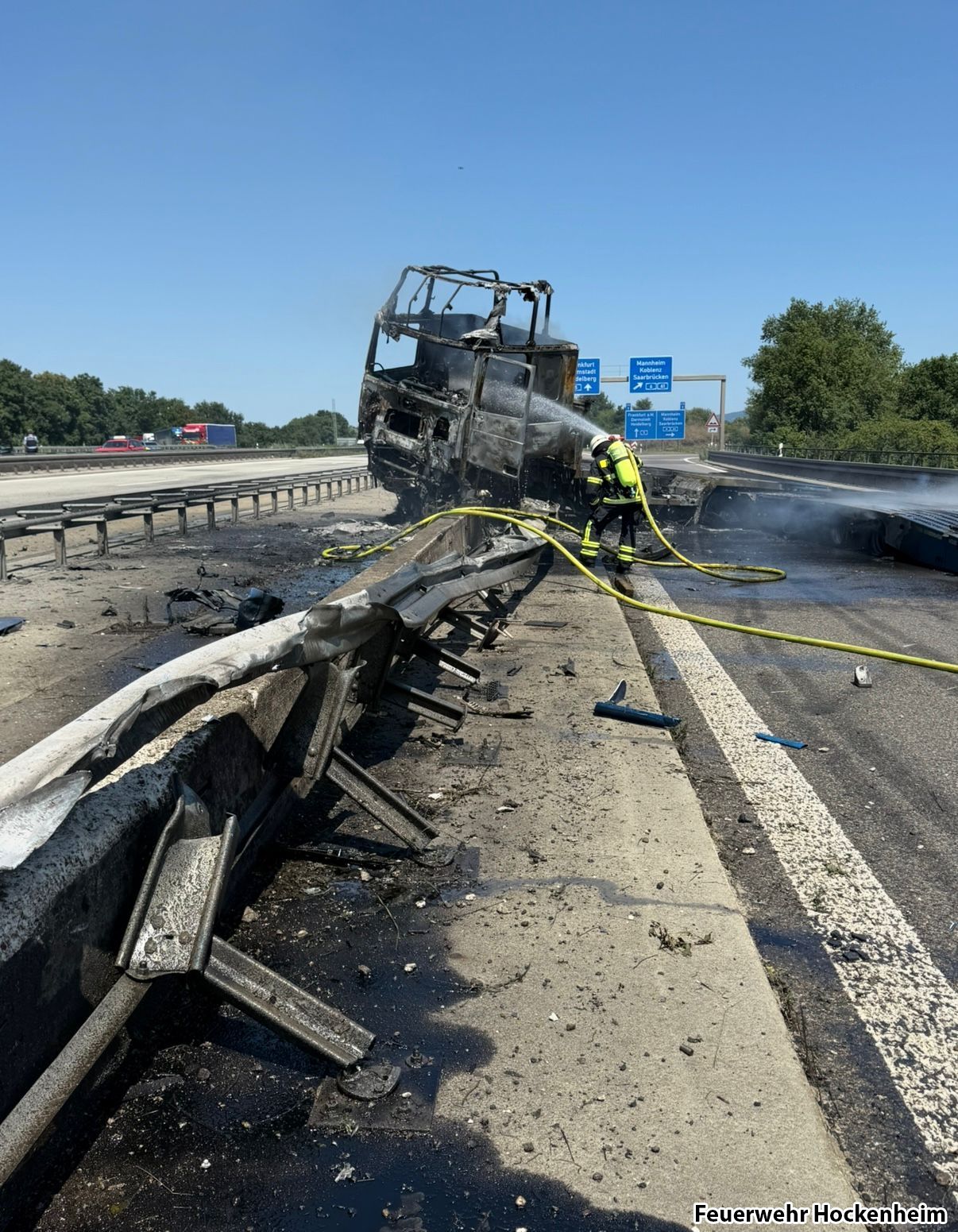 Nach einem Verkehrsunfall stand im Bereich des Walldorfer Kreuzes ein LKW in Vollbrand. Der Fahrer des LKW befand sich noch im Fahrzeug und konnte im weiteren Einsatzverlaufen nur noch tot aus dem ausgebrannten Führerhaus geborgen werden. Die Feuerwehr Hockenheim unterstützte die Kameradinnen und Kameraden aus Walldorf bei der Brandbekämpfung und übernahm dabei den Einsatzabschnitt unterhalb der Autobahnbrücke. Außerdem wurde mit dem Hockenheimer Tanklöschfahrzeug eine Wasserversorgung hergestellt. Während die Feuerwehr Walldorf noch für Nachlöscharbeiten und bis zum Abschluss der Unfallaufnahme vor Ort blieb, konnte der Einsatz der Feuerwehr Hockenheim gegen 14:30 Uhr beendet werden.