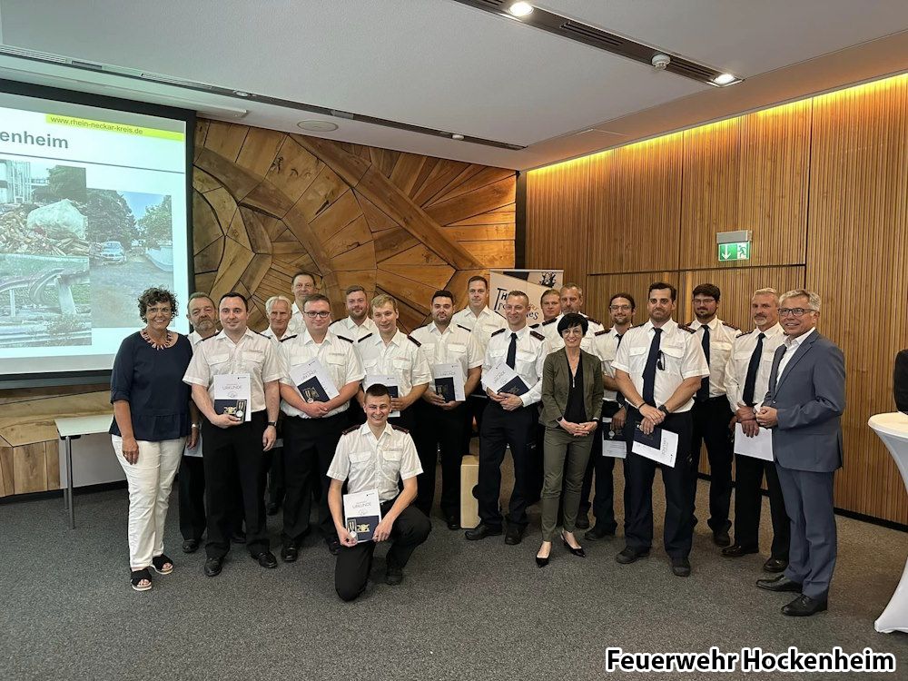 Die Kameradinnen und Kameraden der Feuerwehren aus Hockenheim und Altlußheim, die im Juli 2021 als Hochwasserzug Rhein-Neckar-Kreis im Einsatz waren, durften die Auszeichnung aus den Händen von Regierungspräsidentin Sylvia M. Felder, Landrat Stefan Dallinger und der Heidelberger Bürgermeisterin Stefanie Jansen entgegennehmen.