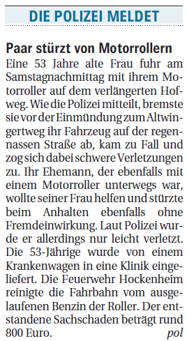 Paar stürzt von Motorrollern Eine 53 Jahre alte Frau fuhr am Samstagnachmittag mit ihrem Motorroller auf dem verlängerten Hofweg. Wie die Polizei mitteilt, bremste sie vor der Einmündung zum Altwingertweg ihr Fahrzeug....