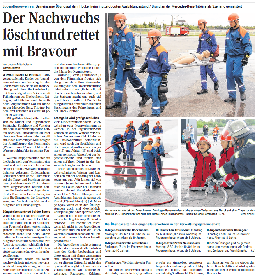 Der Nachwuchs löscht und rettet mit Bravour Aufgeregt saßen die Kinder der Jugendfeuerwehren am Samstag in den Feuerwehrautos, als sie zur HoRANÜbung auf dem Hockenheimring mit Sondersignal ausrückten – mit Teilnehmern aus Hockenheim, Reilingen, Altlußheim und Neulußheim....