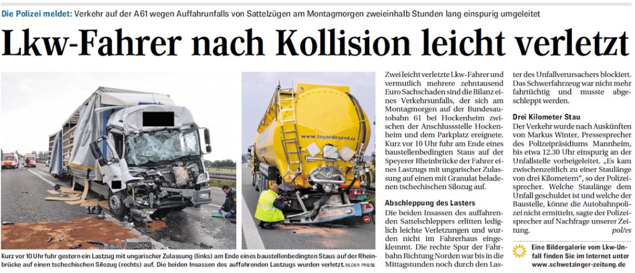 Lkw-Fahrer nach Kollision leicht verletzt Zwei leicht verletzte Lkw-Fahrer und vermutlich mehrere zehntausend Euro Sachschaden sind die Bilanz eines Verkehrsunfalls, der sich am Montagmorgen auf der Bundesautobahn 61 bei Hockenheim zwischen...