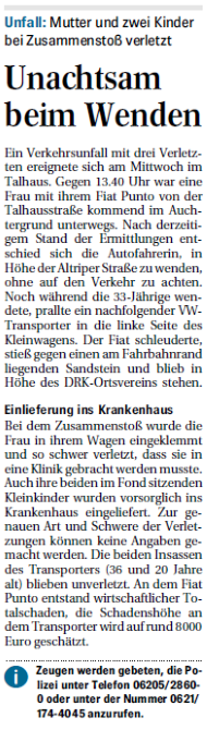 Mutter und zwei Kinder bei Zusammenstoß verletzt Ein Verkehrsunfall mit drei Verletzten ereignete sich am Mittwoch im Talhaus. Gegen 13.40 Uhr war eine Frau mit ihrem Fiat Punto von der Talhausstraße kommend im Auchtergrund unterwegs. Nach .....