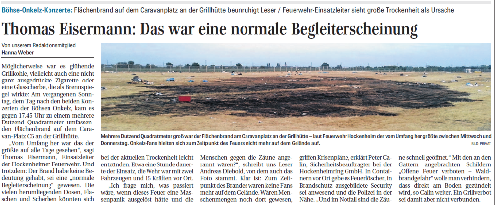 Thomas Eisermann: Das war eine normale Begleiterscheinung Möglicherweise war es glühende Grillkohle, vielleicht auch eine nicht ganz ausgedrückte Zigarette oder eine Glasscherbe, die als Brennspiegel wirkte: Am vergangenen Sonntag, dem Tag nach....