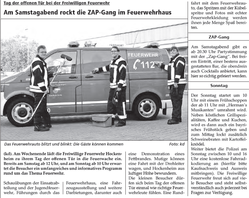 Tag der offenen Tür bei der Freiwilligen Feuerwehr Am Wochenende lädt die Freiwillige Feuerwehr Hockenheim zu ihrem Tag der offenen Tür in die Feuerwache ein. Bereits am Samstag ab 12 Uhr, und am Sonntag ab 10 Uhr erwartet die Besucher ein ....