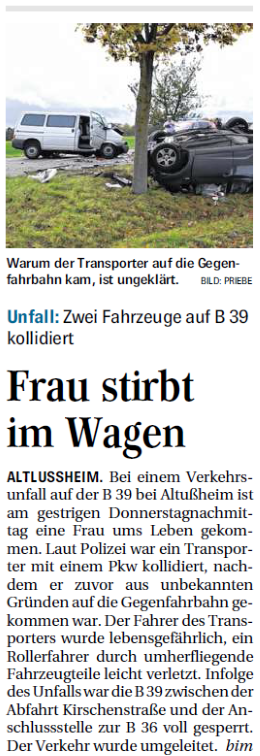 Bei der auf der B39 tödlich verunglückten Pkw-Fahrerin handelt es sich um eine 31-jährige Altlußheimerin / Ermittlungen dauern an