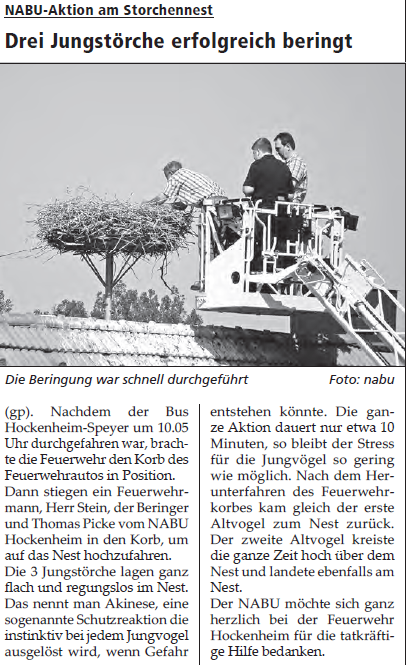 Drei Jungstörche erfolgreich beringt Nachdem der Bus Hockenheim-Speyer um 10.05 Uhr durchgefahren war, brachte die Feuerwehr den Korb des Feuerwehrautos in Position. Dann stiegen ein Feuerwehrmann,Herr Stein, der Beringer und....