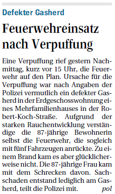 Defekter Gasherd Eine Verpuffung rief gestern Nachmittag, kurz vor 15 Uhr, die Feuerwehr auf den Plan. Ursache für die Verpuffung war nach Angaben der Polizei vermutlich ein defekter Gasherd in der ...