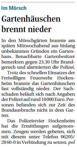 Sie war weit zu sehen, die Rauchwolke, die am Samstagmittag über den Hockenheimer Süden zog und die Feuerwehr um 13.48 Uhr zum Einsatz rief. Ein Gartenhaus im Kleingartengebiet nahe des ...