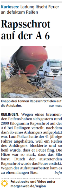 Wegen eines brennenden Reifens haben sich gestern rund 2800 Kilogramm Rapsschrot auf der A 6 bei Reilingen verteilt, nachdem das Silo eines Anhängers aufgeplatzt war. Laut Polizei hatte der...