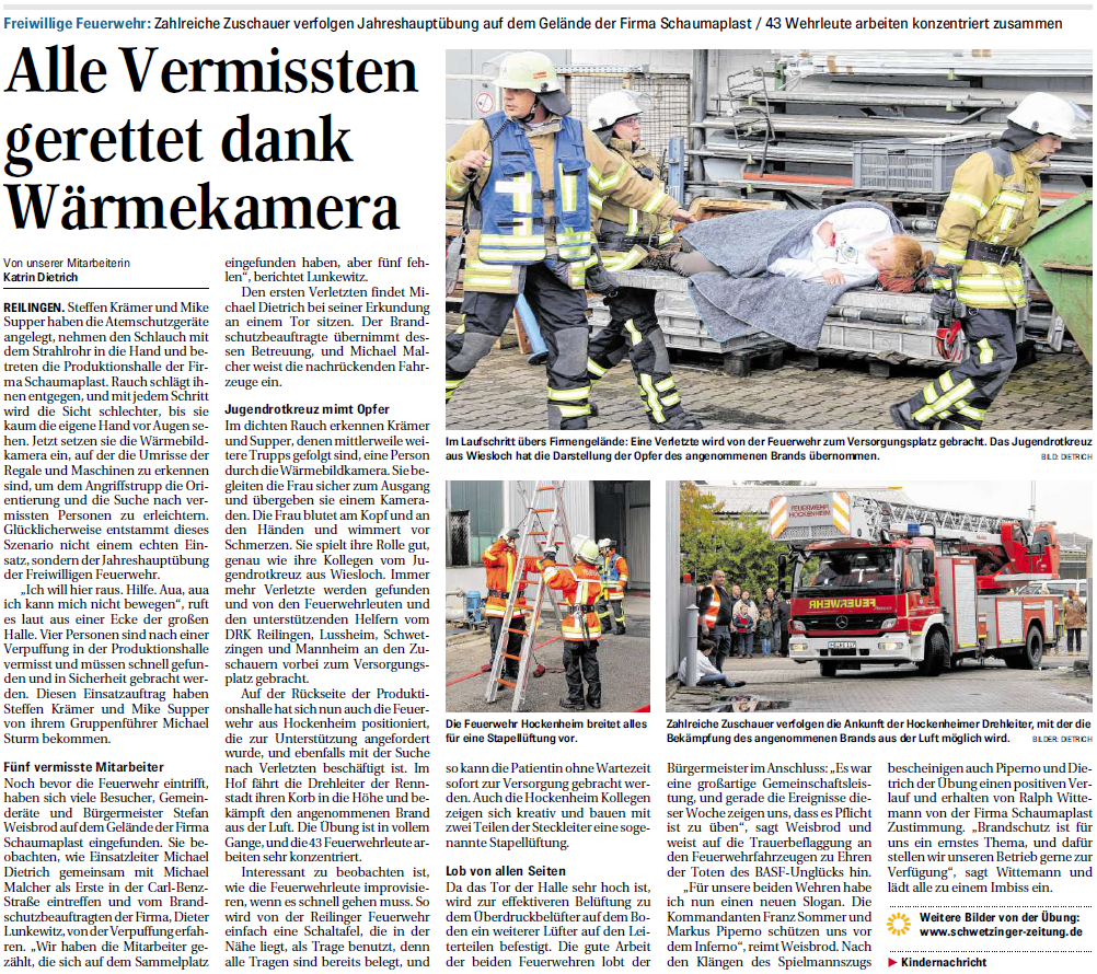 43 Wehrleute arbeiten konzentriert zusammen Steffen Krämer und Mike Supper haben die Atemschutzgeräte angelegt, nehmen den Schlauch mit dem Strahlrohr in die Hand und betreten die Produktionshalle der Firma Schaumaplast. Rauch schlägt ihnen entgegen, und mit jedem Schritt wird die Sicht ....
