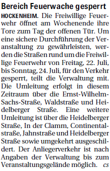 Die Freiwillige Feuerwehr öffnet am Wochenende ihre Tore zum Tag der offenen Tür. Um eine sichere Durchführung der Veranstaltung zu gewährleisten, werden die Straßen rund um die Freiwillige Feuerwehr von Freitag, 22. Juli, bis Sonntag ....