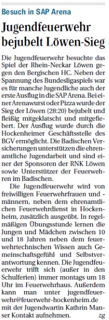 Besuch in SAP Arena Die Jugendfeuerwehr besuchte das Spiel der Rhein-Neckar Löwen gegen den Bergischen HC. Neben der Spannung des Bundesligaspiels war es für manche Jugendliche auch der erste Ausflug in die SAP...