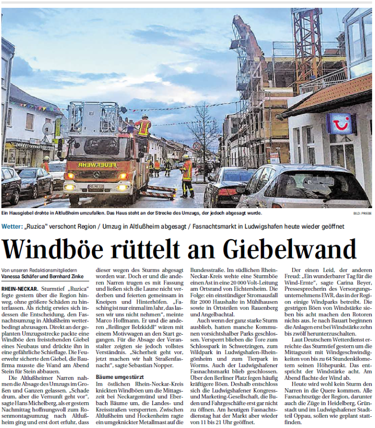 Sturmtief „Ruzica“ fegte gestern über die Region hinweg, ohne größere Schäden zu hinterlassen. Als richtig erwies sich indessen die Entscheidung, den Fasnachtsumzug in Altlußheim wetterbedingt....