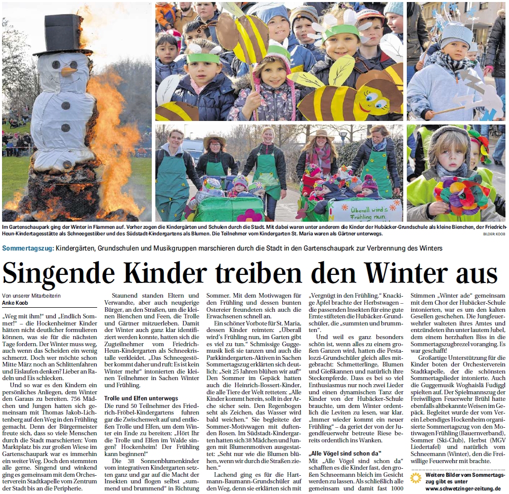 „Weg mit ihm!“ und „Endlich Sommer!“ – die Hockenheimer Kinder hätten nicht deutlicher formulieren können, was sie für die nächsten Tage fordern. Der Winter muss weg, auch wenn das Scheiden ein wenig schmerzt. Doch wer möchte schon Mitte März noch an Schlittenfahren..