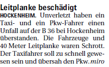 Unverletzt haben ein Taxi- und ein Pkw-Fahrer einen Unfall auf der B 36 bei Hockenheim überstanden. Die Fahrzeuge und 40 Meter Leitplanke waren Schrott ...