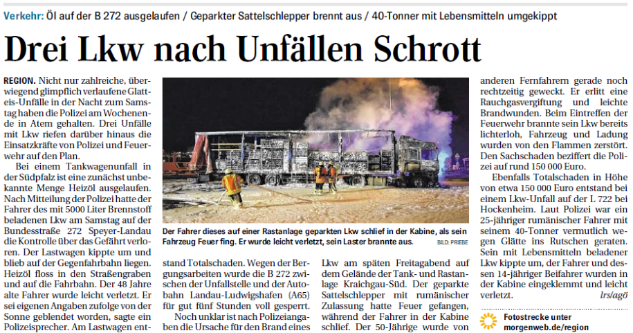 Nicht nur zahlreiche, überwiegend glimpflich verlaufene Glatteis- Unfälle in der Nacht zum Samstag haben die Polizei am Wochenende in Atem gehalten. Drei Unfälle mit Lkw riefen darüber hinaus die ....