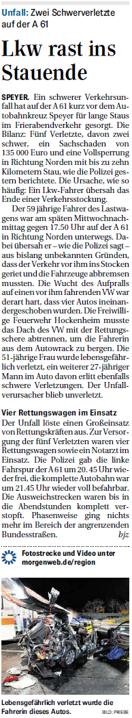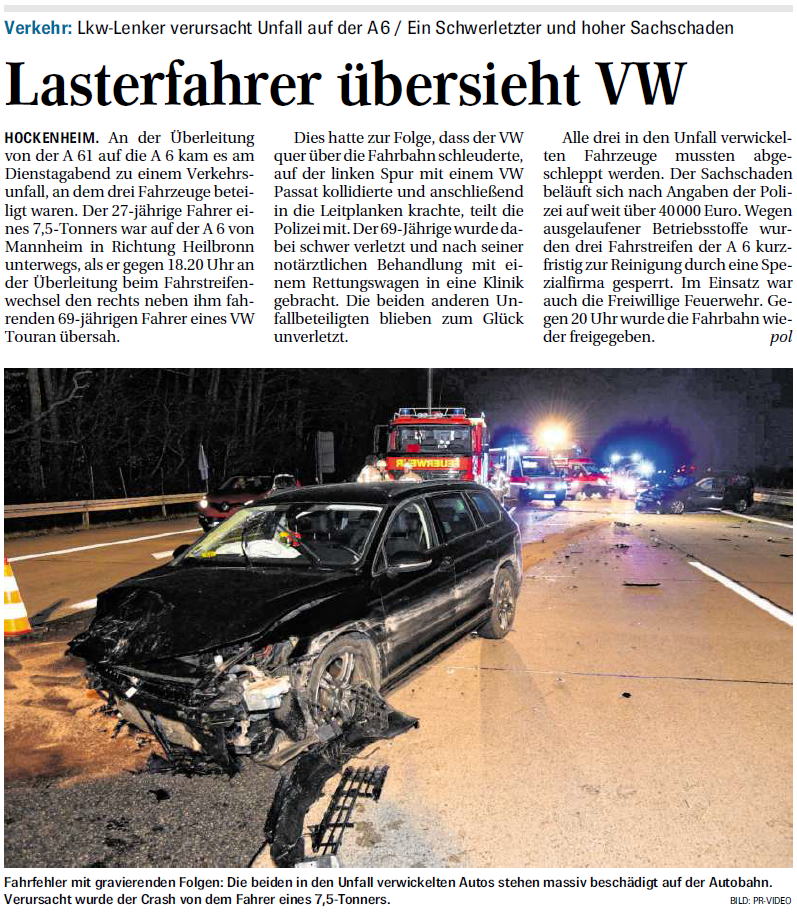 Lkw-Lenker verursacht Unfall auf der A6 An der Überleitung von der A 61 auf die A 6 kam es am Dienstagabend zu einem Verkehrsunfall, an dem drei Fahrzeuge beteiligt waren. Der 27-jährige Fahrer eines 7,5-Tonners war auf der A 6 von Mannheim in Richtung Heilbronn unterwegs, als er gegen 18.20 Uhr an der Überleitung beim Fahrstreifenwechsel den rechts neben ......