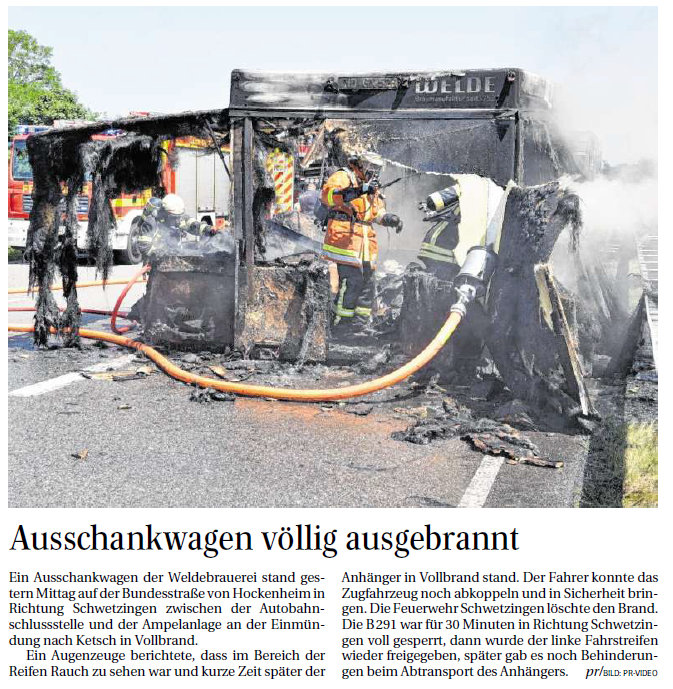 Ein Ausschankwagen der Weldebrauerei stand gestern Mittag auf der Bundesstraße von Hockenheim in Richtung Schwetzingen zwischen der Autobahnschlussstelle und der Ampelanlage an der Einmündung nach Ketsch in Vollbrand. Ein Augenzeuge berichtete ...