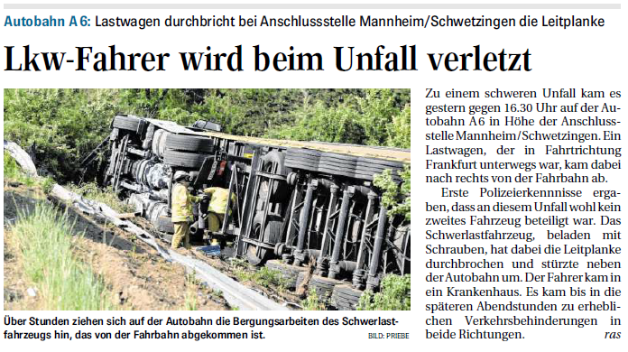 Lastwagen durchbricht Leitplanke Zu einem schweren Unfall kam es gestern gegen 16.30 Uhr auf der Autobahn A 6 in Höhe der Anschlussstelle Mannheim/Schwetzingen. Ein Lastwagen, der in Fahrtrichtung Frankfurt unterwegs war, kam dabei nach rechts von der Fahrbahn....
