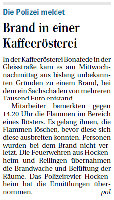 Die Polizei meldet In der Kaffeerösterei Bonafede in der Gleisstraße kam es am Mittwochnachmittag aus bislang unbekannten Gründen zu einem Brand, bei dem ein Sachschaden von mehreren Tausend Euro entstand. Mitarbeiter bemerkten gegen 14.20 Uhr die .....