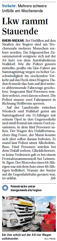 Mehrere schwere Unfälle am Wochenende Bei Unfällen auf den Straßen der Region sind am Wochenende mehrere Menschen verletzt worden. Ein folgenreicher Zusammenstoß ereignete sich auf der A 6 kurz vor dem Autobahnkreuz Walldorf. Wie die Polizei gestern mitteilte, prallte ein Lkw-Fahrer ...