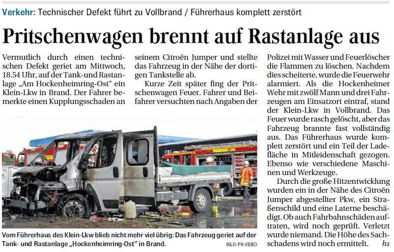 Technischer Defekt führt zu Vollbrand Vermutlich durch einen technischen Defekt geriet am Mittwoch, 18.54 Uhr, auf der Tank- und Rastanlage „Am Hockenheimring-Ost“ ein Klein-Lkw in Brand. Der Fahrer bemerkte einen Kupplungsschaden an seinem Citroën Jumper und stellte das Fahrzeug ....