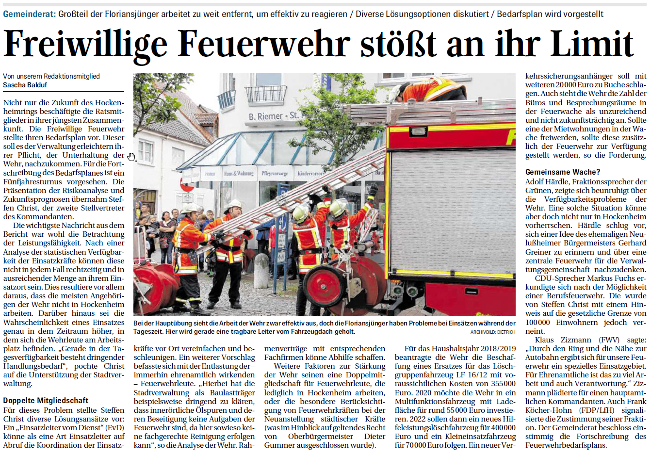 Bedarfsplan wird vorgestellt Nicht nur die Zukunft des Hockenheimrings beschäftigte die Ratsmitglieder in ihrer jüngsten Zusammenkunft. Die Freiwillige Feuerwehr stellte ihren Bedarfsplan vor. Dieser soll es der Verwaltung erleichtern ihrer Pflicht, der Unterhaltung der Wehr, nachzukommen. Für die Fortschreibung des Bedarfsplanes ist ein Fünfjahresturnus vorgesehen. Die Präsentation .....
