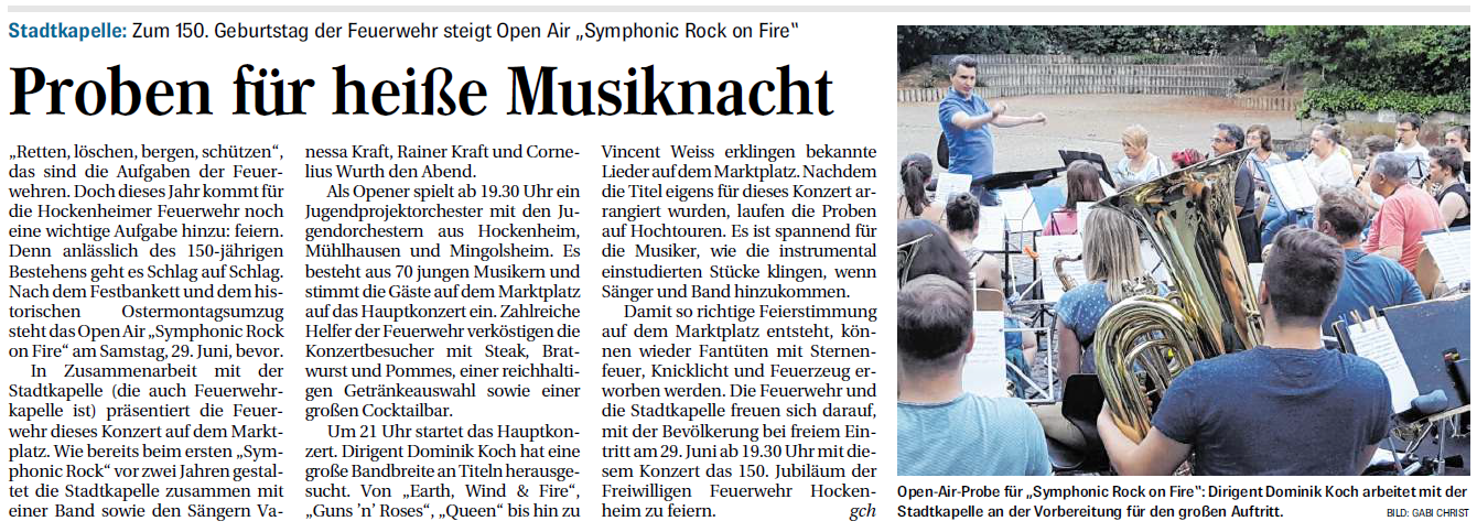 Zum 150. Geburtstag der Feuerwehr steigt Open Air „Symphonic Rock on Fire“ „Retten, löschen, bergen, schützen“, das sind die Aufgaben der Feuerwehren. Doch dieses Jahr kommt für die Hockenheimer Feuerwehr noch eine wichtige Aufgabe hinzu: feiern. Denn anlässlich des 150-jährigen Bestehens geht es Schlag auf Schlag. Nach dem Festbankett ....