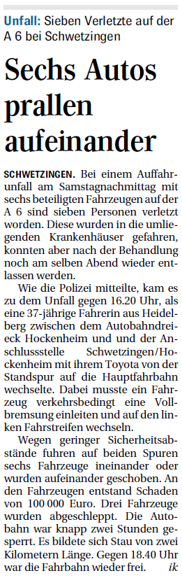 Sieben Verletzte auf der A 6 bei Schwetzingen Bei einem Auffahrunfall am Samstagnachmittag mit sechs beteiligten Fahrzeugen auf der A 6 sind sieben Personen verletzt worden. Diese wurden in die umliegenden Krankenhäuser gefahren, konnten aber nach der Behandlung noch am selben Abend wieder entlassen werden.....