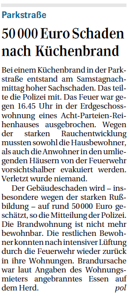 Bei einem Küchenbrand in der Parkstraße entstand am Samstagnachmittag hoher Sachschaden.