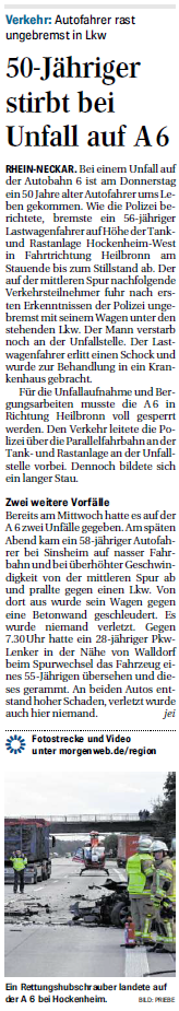 Bei einem Unfall auf der Autobahn 6 bei Hockenheim ist am Dienstag ein
