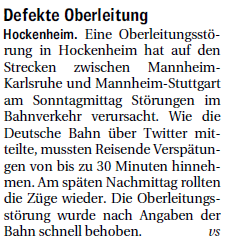 IN KÜRZE Eine Oberleitungsstörung in Hockenheim hat auf den Strecken zwischen Mannheim - Karlsruhe und Mannheim-Stuttgart am Sonntagmittag Störungen im Bahnverkehr verursacht. Wie die Deutsche Bahn über Twitter mitteilte, mussten Reisende Verspätungen ....