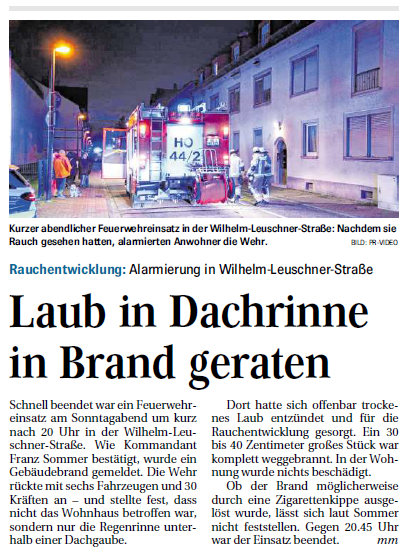 Alarmierung in Wilhelm-Leuschner-Straße Schnell beendet war ein Feuerwehreinsatz am Sonntagabend um kurz nach 20 Uhr in der Wilhelm-Leuschner- Straße. Wie Kommandant Franz Sommer bestätigt, wurde ein Gebäudebrand gemeldet ....