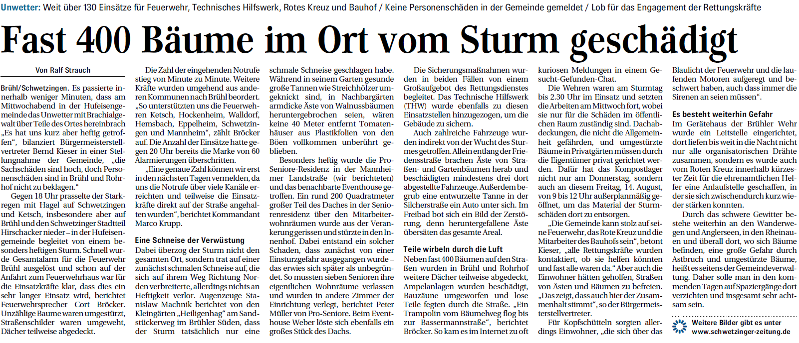 Keine Personenschäden in der Gemeinde gemeldet Es passierte innerhalb weniger Minuten, dass am Mittwochabend in der Hufeisengemeinde das Unwetter mit Brachialgewalt über Teile des Ortes hereinbrach „Es hat uns kurz aber heftig getroffen“, bilanziert Bürgermeisterstellvertreter Bernd Kieser in einer Stellungnahme der ....