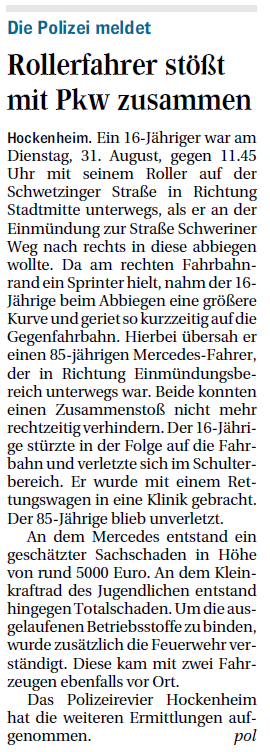 Ein 16-Jähriger war am Dienstag, 31. August, gegen 11.45 Uhr mit seinem Roller auf der Schwetzinger