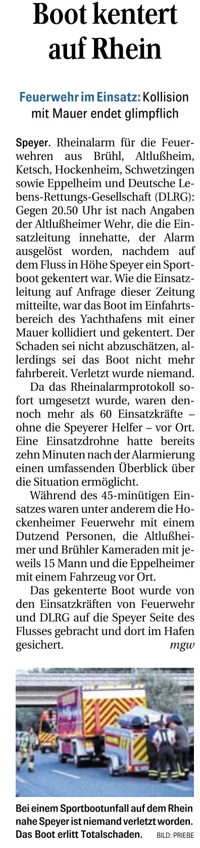 Kollision mit Mauer endet glimpflich Rheinalarm für die Feuerwehren aus Brühl, Altlulheim,Ketsch, Hockenheim, Schwetzingen sowie Eppelheim und Deutsche Lebens-Rettungs Gesellschaft(DLRG): Gegen 20.50 Uhr ist nach Angaben der Altlußheimer Wehr, die die Einsatzleitung innehatte, der Alarm ausgelöst worden, nachdem auf ......