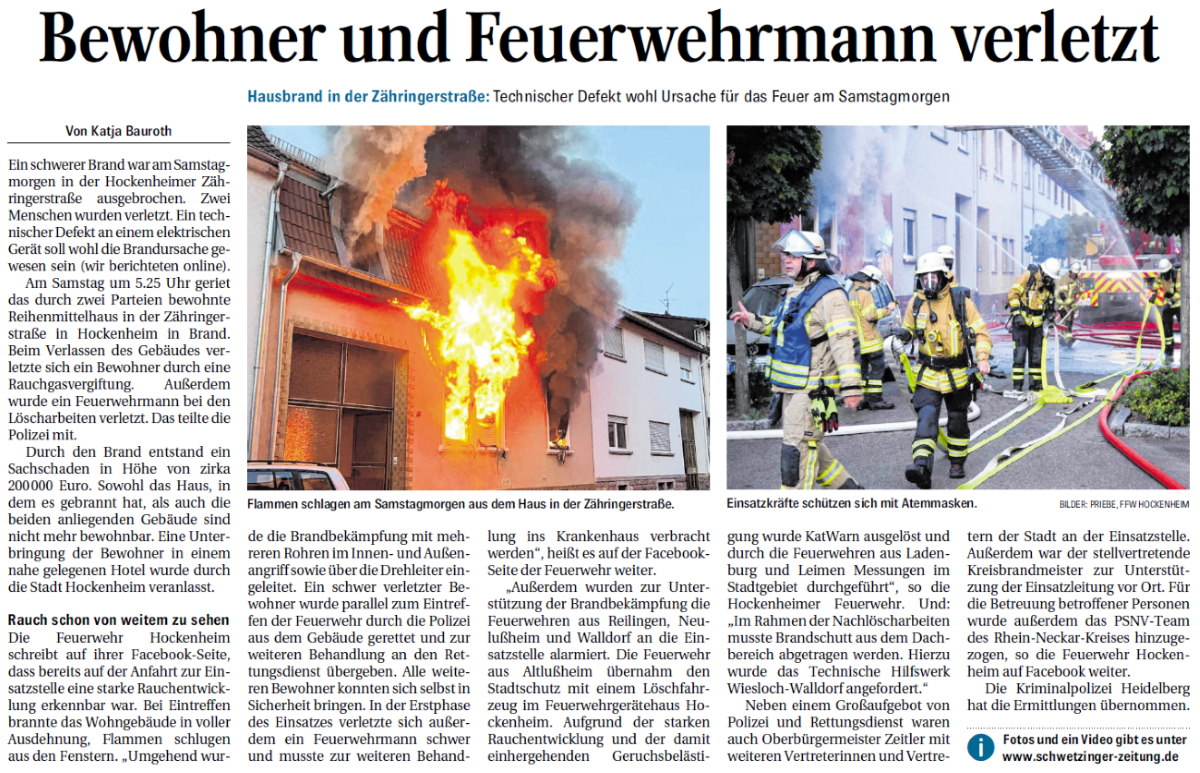 Hausbrand in der Zähringerstraße: Ein schwerer Brand war am Samstag morgen in der Hockenheimer Zähringerstraße ausgebrochen. Zwei Menschen wurden verletzt. Ein technischer Defekt an einem elektrischen Gerät soll wohl die Brandursache gewesen sein (wir berichteten online). Am Samstag um 5.25 Uhr geriet das durch zwei Parteien bewohnte Reihenmittelhaus in der Zähringerstraße in Hockenheim in Brand. Beim Verlassen ....