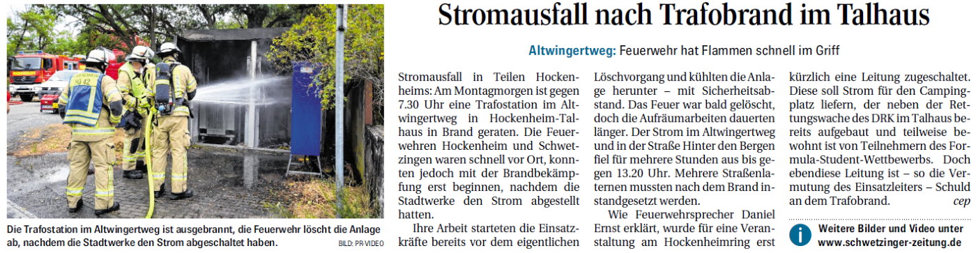 Stromausfall in Teilen Hockenheims: Am Montagmorgen ist gegen 7.30 Uhr eine Trafostation im Altwingertweg in