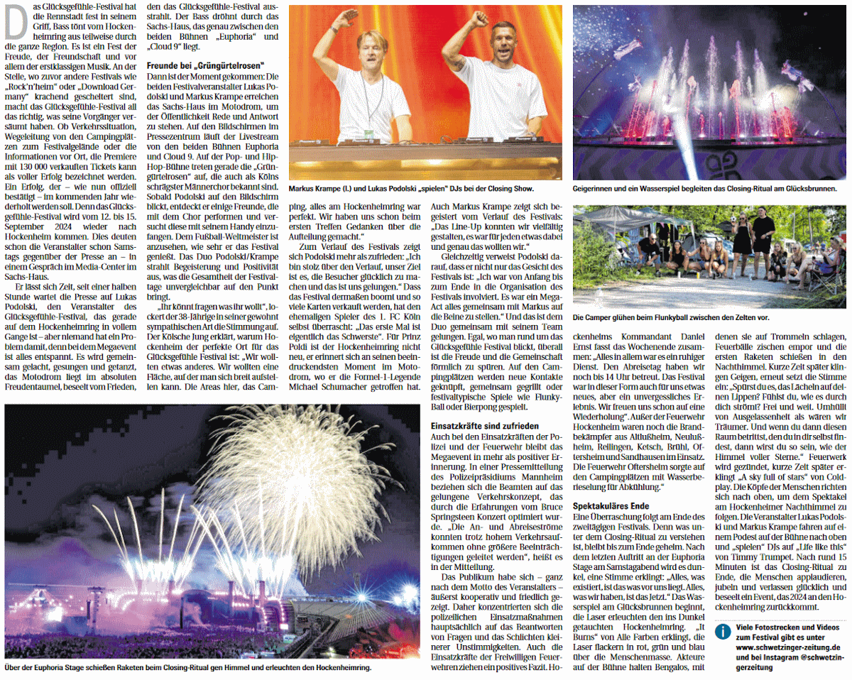 Einsatzkräfte sind zufrieden Das Glücksgefühle-Festival hat die Rennstadt fest in seinem Griff, Bass tönt vom Hockenheimring aus teilweise durch die ganze Region. Es ist ein Fest der Freude, der Freundschaft und vor allem der erstklassigen Musik. An der Stelle, wo zuvor andere Festivals wie „Rock’n’heim“ oder „Download Germany“ krachend gescheitert sind ....