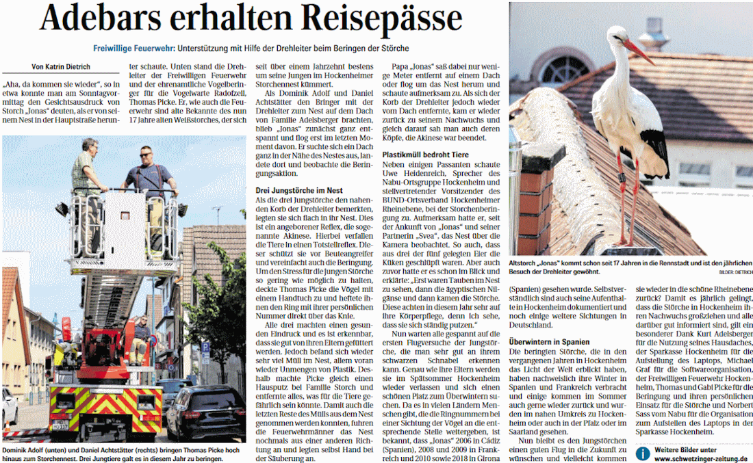 Unterstützung mit Hilfe der Drehleiter beim Beringen der Störche „Aha, da kommen sie wieder“, so in etwa konnte man am Sonntagvormittag den Gesichtsausdruck von Storch „Jonas“ deuten, als er von seinem Nest in der Hauptstraße herunter schaute. Unten stand die Drehleiter der Freiwilligen Feuerwehr und der ehrenamtliche Vogelberinger für die Vogelwarte Radofzell, Thomas Picke. Er, wie auch die Feuerwehr ....